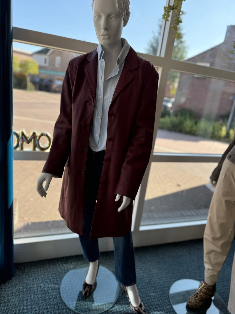 Blouse van Supertrash – een knipoog naar retro met een moderne twist (maat 38) Blazer van ZARA – met warme bordeaux kleur en veel karakter.maat 40. Broek van Tramontana – Prachtig model met wat uitlopende pijp maat 38.