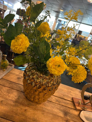 Mooie gouden framboos vaas met een heerlijk fris geel boeket.